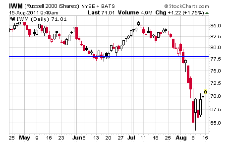 As we all know the market fell sharply last week and now the small cap ETF, iShares Russell 2000 (NYSE:IWM) is roughly 18 percent below its high a month ago.