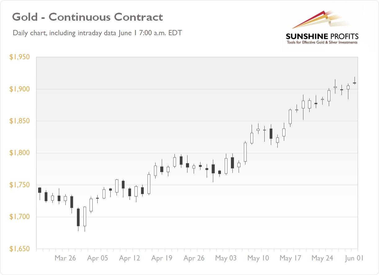 The gold futures contract gained 0.36% on Friday, as it continued to fluctuate following its recent advances. On Wednesday gold price was the highest since early January. In April the market has bounced from the support level marked by March 8 local low of $1,663.30. Since then it has been advancing. Today gold has extended the uptrend, as we can see on the daily chart (the chart includes today’s intraday data):